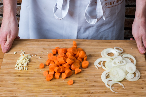 Den Backofen auf 200°C (180°C Umluft) vorheizen. Die Karotte ggf. schälen und grob würfeln. Die Zwiebel und den Knoblauch schälen und halbieren. Die Zwiebel in feine Streifen schneiden, den Knoblauch grob hacken.