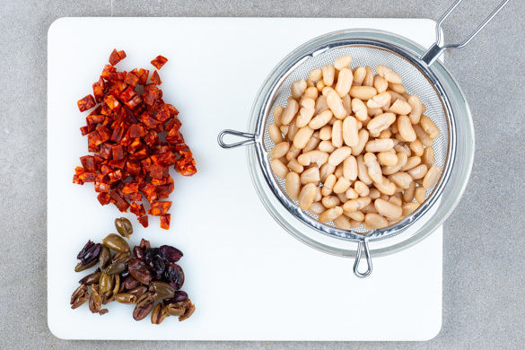 Die Chorizo in ca. 0,5cm kleine Würfel schneiden. Die Oliven längs halbieren. Die Bohnen in ein Sieb abgießen und abtropfen lassen.