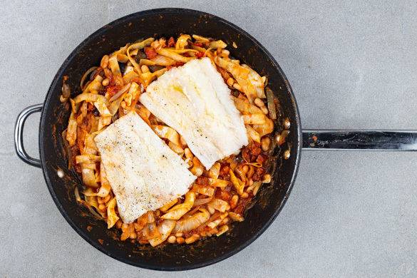 Manchmal darf, ja sollte man Fisch und Fleisch kombinieren! Hier verfeinert leckere Chorizo-Wurst mit ihrem würzigen Aroma das Ragout aus Weißkohl, Cannellinibohnen, gehackten Tomaten und schwarzen Oliven. Darauf gebettet wird das zarte Kabeljaufilet im Dampf gegart. Einfach wunderbar!
