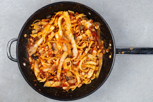 Den Knoblauch, die Oliven und die Bohnen unterrühren und mit den gehackten Tomaten und 250–300ml Wasser ablöschen. Mit Salz und Pfeffer würzen und alles ca. 2Min. bei niedriger Hitze sanft köcheln lassen.