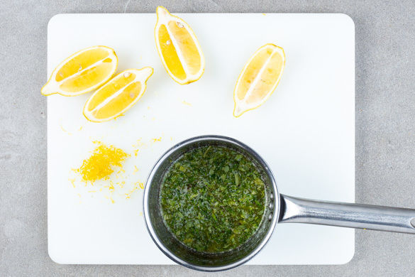 Die Estragonblätter abzupfen und fein schneiden. Die Zitronenschale abreiben, dann die Zitrone halbieren und in Spalten schneiden. Den Estragon und den Zitronenabrieb in die Butter rühren und mit 1 Prise Salz und Pfeffer würzen.