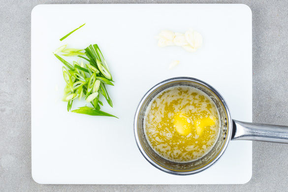 In einem großen Topf ausreichend gesalzenes Wasser für die Pasta zum Kochen bringen. Die Lauchzwiebeln schräg in dünne Ringe schneiden. Den Knoblauch schälen und in feine Scheibchen schneiden. In einem kleinen Topf 3–4EL Butter bei niedriger Hitze schmelzen.