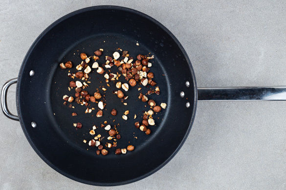 Die Haselnüsse grob hacken und in einer großen Pfanne bei mittlerer Hitze 2–3Min. anrösten. Inzwischen den Käse fein reiben. Die Nüsse auf einem Teller beiseitestellen und den Knoblauch in derselben Pfanne mit 2EL Olivenöl bei mittlerer Hitze ca. 1Min. anbraten.
