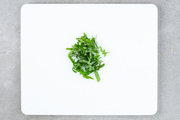 Die Basilikumblätter abzupfen und grob schneiden. Auf der fertigen Galette verteilen und servieren.