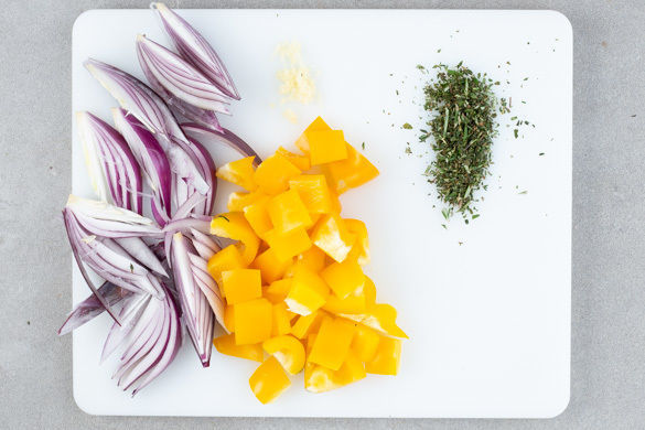 Die Zwiebel schälen, halbieren und in ca. 2cm breite Spalten schneiden. Den Knoblauch schälen und fein reiben. Die Paprika halbieren, entkernen und in ca. 2cm große Würfel schneiden. Den Rosmarin und den Thymian abzupfen und fein schneiden, dann mit dem Gemüse, den Oliven und 1TL Olivenöl vermengen und kräftig mit Salz und Pfeffer würzen.