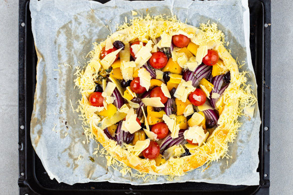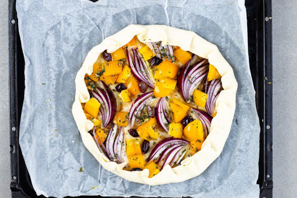 Den Teig gleichmäßig mit der Zwiebelmarmelade bestreichen und mit dem Gemüsemix belegen, dabei einen ca. 2–3cm breiten Rand aussparen. Den Teigrand über das Gemüse klappen. Tipp: Wer mag, kann 1 Eigelb verquirlen und den Teigrand damit bestreichen. Die Galette ca. 10Min. im Ofen backen.
