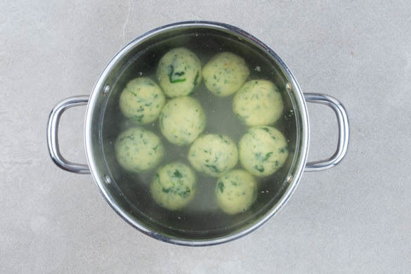 Die Knödel in das kochende Wasser geben, einmal aufkochen lassen und dann ohne Hitzezufuhr 20–25Min. gar ziehen lassen.