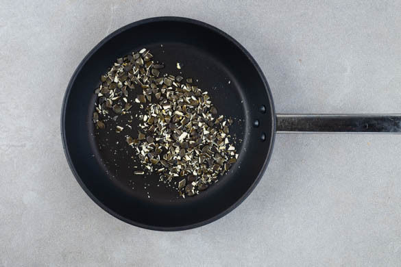 Die Kürbiskerne grob hacken und in einer kleinen Pfanne bei mittlerer Hitze 2–3Min. anrösten. Zum Abkühlen auf einem Teller beiseitestellen.