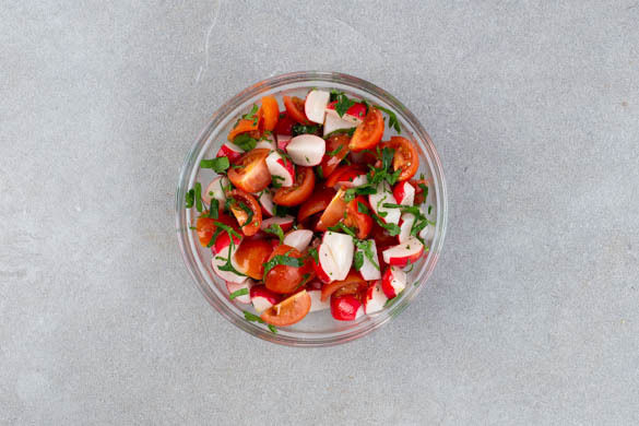 Die Radieschen und die Kirschtomaten vierteln. Die Petersilie samt Stängeln fein hacken. Aus 3–4EL Olivenöl, 3–4EL (hellem) Essig und je 1TL Salz, Pfeffer und Zucker ein Dressing anrühren und mit den Radieschen, den Tomaten und der 1/2 der Petersilie vermengen.