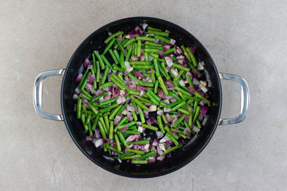 Die Zwiebeln schälen, halbieren und grob würfeln. Die Enden der Bohnen entfernen und die Bohnen je nach Größe quer halbieren. Die Zwiebeln und die Bohnen in einem großen Topf mit 3EL Butter und je ½TL Salz und Pfeffer bei mittlerer Hitze 5–8Min. braten, bis sie weich werden.
