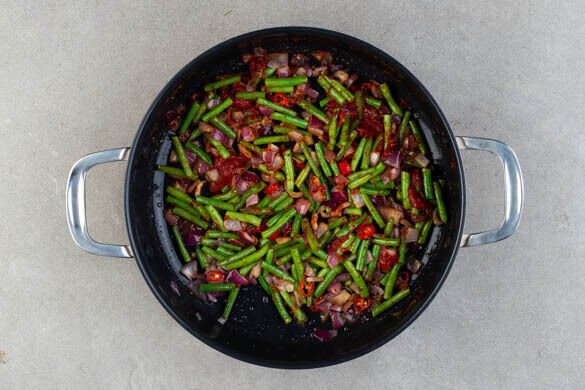 Die Oliven grob schneiden. Die Peperoni in feine Ringe schneiden. Tipp: Für weniger Schärfe die Kerne entfernen. Die Peperoniringe, das Tomatenmark, die ½ der Gewürzmischung und 2TL Honig unter die Bohnen rühren und ca. 1Min. mitrösten.