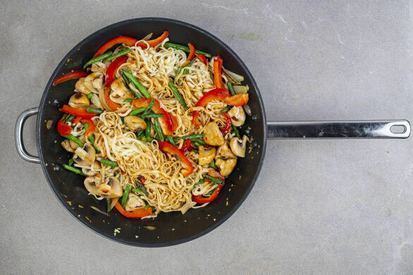 Das Gemüse mit der Würzsauce ablöschen, dann die Nudeln und den Koriander untermischen. Die Nudeln ca. 2Min. mitbraten, bis sie bissfest sind, dabei nach Bedarf etwas Wasser zugeben.