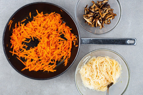 Die Karotten schälen und grob reiben. Die Shiitakepilze ggf. säubern und in dünne Scheiben schneiden, dabei die Stiele entfernen. Die Lauchzwiebel putzen und in feine Ringe schneiden. Die Gurke längs halbieren und in dünne Scheiben schneiden. Den Tofu mit Küchenkrepp möglichst gut auspressen, dann in ca. 2cm große Würfel schneiden.