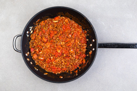 Die Zwiebeln in einer großen Pfanne mit 1EL Olivenöl bei mittlerer Hitze 1Min. leicht anbraten. Mit Salz und Pfeffer würzen, dann die gehackten Tomaten und den Knoblauch unterrühren und alles bei mittlerer Hitze ca. 5Min. sanft köcheln lassen. Die Linsen hinzugeben und 3–4Min. mitköcheln lassen.