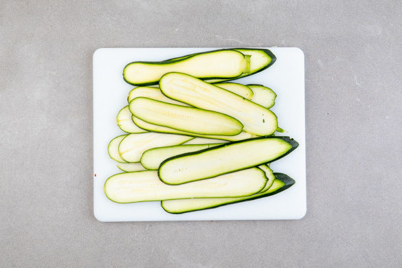 Die Zucchini mit einem großen Messer oder einem Gemüsehobel in sehr dünne und lange Streifen schneiden. Eine Auflaufform mit 1–2EL Olivenöl fetten.