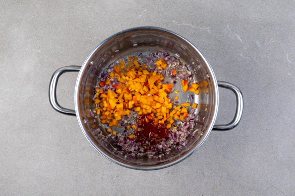 Die Zwiebeln und den Knoblauch in dem Topf mit 1EL Olivenöl bei mittlerer Hitze ca. 2Min. farblos anschwitzen. Die Aprikosen, die ½ der Sweet-Chili-Sauce, 2–3EL Wasser und ½TL Zucker unterrühren und 1–2Min. karamellisieren lassen. Nach Geschmack mit 1TL Essig ablöschen und mit Salz und Pfeffer würzen. Ggf. etwas einkochen lassen.