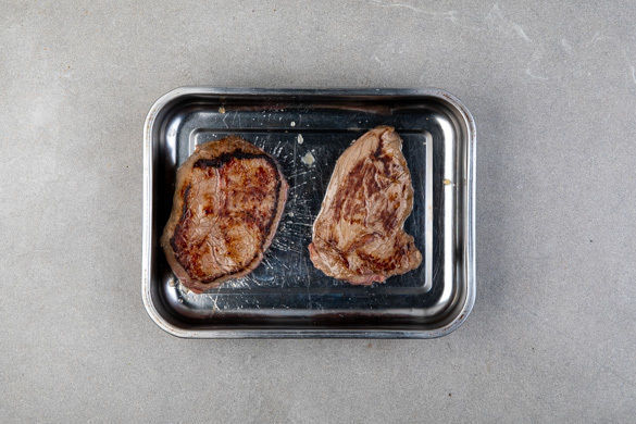 Das Fleisch trocken tupfen und in einer großen Pfanne mit 2EL Olivenöl bei starker Hitze auf jeder Seite 1–2Min. scharf anbraten. Mit Salz und Pfeffer würzen, in eine Auflaufform geben und im Ofen 4–6Min. oder bis zum gewünschten Garpunkt nachgaren. Aus dem Ofen nehmen und 2–3Min. ruhen lassen. Tipp: Der Fleischsaft kann unter das Relish gemischt werden.