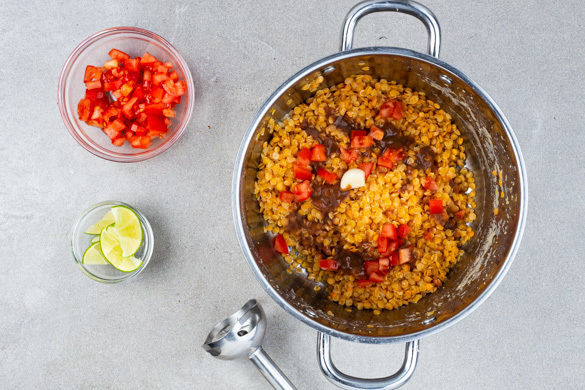 Die Tomate fein würfeln. Den Knoblauch schälen. Die Limette halbieren, eine Hälfte in Spalten schneiden, die andere Hälfte auspressen. Die restlichen Linsen mit der ½ der Tomatenwürfel, dem Knoblauch, dem Limettensaft und 1EL Olivenöl pürieren. Mit Salz, Pfeffer abschmecken.