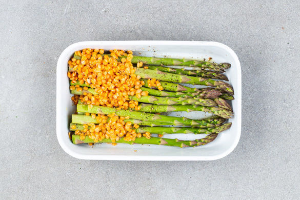Die unteren, holzigen Enden des Spargels abtrennen. Den Spargel mit den bissfest gekochten Linsen, 2EL Olivenöl und je 1 kräftigen Prise Salz, Pfeffer und Zucker vermengen und in eine Auflaufform geben. Im Ofen 10–12Min. backen
