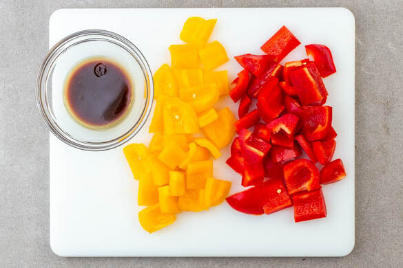 Inzwischen die Paprika vierteln, entkernen und in ca. 3cm große Stücke schneiden. Die Granatapfelmelasse mit 3EL Olivenöl und 1EL Essig zu einem Dressing verrühren.