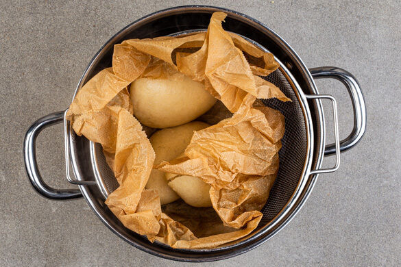 Ein ausreichend großes Stück Backpapier zerknüllen, wieder glätten und damit den Dämpfkorb oder das Sieb auslegen. Die Hefebrötchen hineingeben und abgedeckt in ca. 7Min. weich dämpfen. Vorsicht, heißer Dampf! Tipp: Die Brötchen nach dem Dämpfen mit einem Handtuch abdecken, damit sie feucht und warm bleiben.