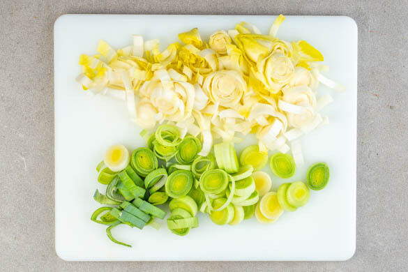 Den Backofen auf 230°C (210°C Umluft) vorheizen. Den Chicorée und den Lauch in ca. 0,5cm breite Ringe schneiden.