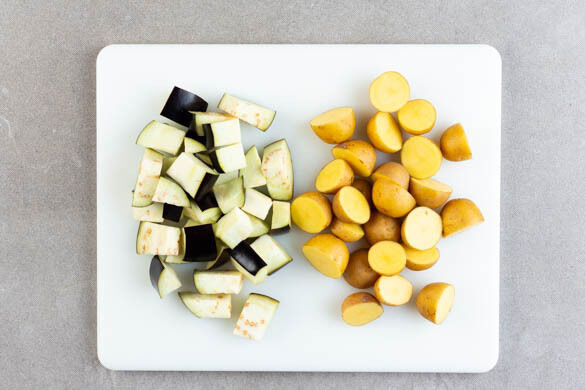 Die Auberginen in ca. 2cm große Würfel schneiden. Die Kartoffeln samt Schale je nach Größe halbieren oder vierteln.