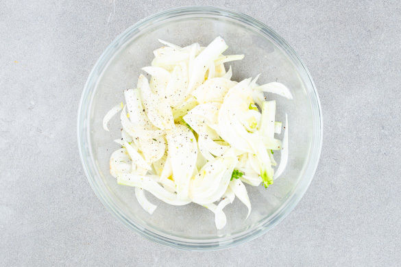 Inzwischen den Fenchel putzen, längs halbieren und in dünne Scheiben schneiden. Das Fenchelgrün für die Garnitur beiseitelegen. Den Fenchel mit 2–3EL Zitronensaft sowie Salz und Pfeffer mischen.