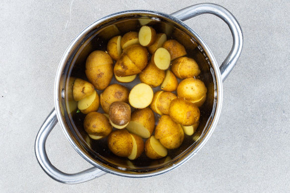 Große Kartoffeln ggf. halbieren, dann die Kartoffeln in einem großen Topf mit dem kochenden Wasser übergießen, salzen und bei starker Hitze 10–15Min. kochen, bis sie durch sind. In ein Sieb abgießen und abtropfen lassen.
