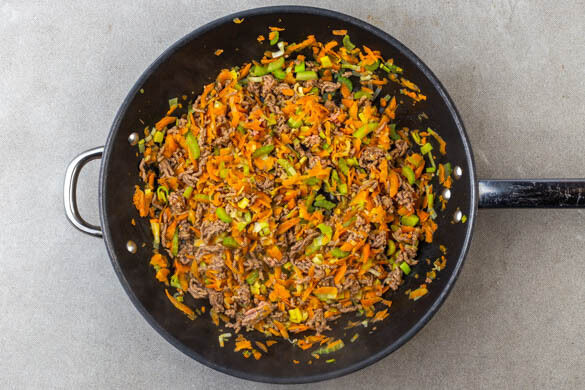 Den Lauch längs halbieren und quer in dünne Streifen schneiden. Die Karotte ggf. schälen und grob raspeln. Den Sellerie längs halbieren und in kleine Würfel schneiden. Das Gemüse in einer mittelgroßen Pfanne mit 1EL Olivenöl bei mittlerer bis starker Hitze 2–3Min. anbraten. Das Hackfleisch zugeben und weitere 2–3Min. braten.