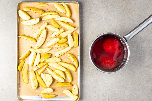 Den Backofen auf 220°C (200°C Umluft) vorheizen. Die Rote Bete schälen, in dünne Scheiben schneiden, in einem kleinen Topf mit ausreichend Wasser aufkochen und bei starker Hitze abgedeckt ca. 15Min. weich garen. Die Kartoffeln in ca. 1cm breite Spalten schneiden, mit 1EL Olivenöl, der ½ der Gewürzmischung, ½TL Salz und 1 Prise Pfeffer vermengen und 20–25Min. im Ofen backen.