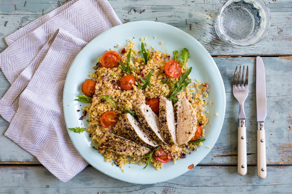 Das Hähnchen wird mit orientalischer Za'atar-Gewürzmischung verfeinert und zusammen mit süßen Kirschtomaten im Ofen gebacken, bis es außen schön kross, aber innen noch saftig ist. Dazu gibt es einen leichten Bulgursalat mit Rucola und Zitrone. Guten Appetit!