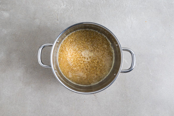Das Brühgewürz im kochenden Wasser auflösen, dann den Bulgur unterrühren und bei niedriger Hitze 8–10Min. quellen lassen.