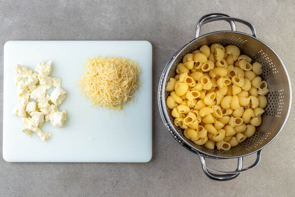 In einem großen Topf ausreichend gesalzenes Wasser für die Pasta zum Kochen bringen. Inzwischen den Hartkäse fein reiben, die Hälfte für Schritt 6 beiseitestellen. Den Mozzarella abtropfen lassen und in mundgerechte Stücke zupfen. Die Pasta in das kochende Wasser geben und in 9–11Min. bissfest kochen. In ein Sieb abgießen und abtropfen lassen.