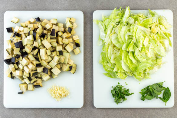 Die Auberginen in ca. 1cm große Würfel schneiden. Den Knoblauch schälen und fein würfeln. Die ½ des Basilikums für Schritt 6 aufbewahren. Die ½ des restlichen Basilikums schneiden und die Blätter der anderen Hälfte abzupfen. Die ½ des Salats schneiden, den Rest für Schritt 6 aufbewahren.