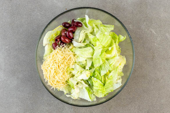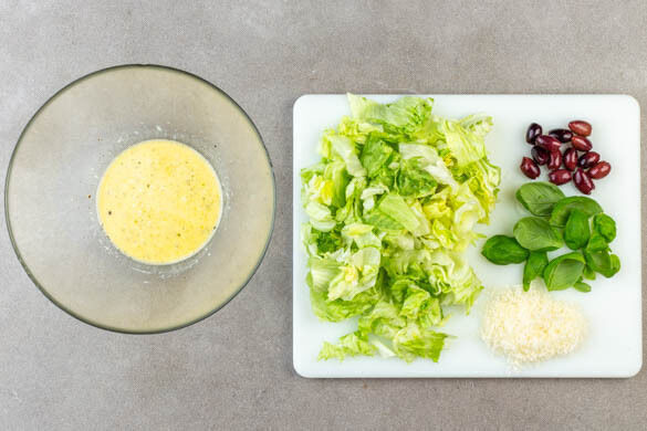 3EL Mayonnaise, 2EL Olivenöl, 2EL Essig und je 1 kräftigen Prise Salz und Pfeffer zu einem Dressing verrühren. Den restlichen Salat mundgerecht zerkleinern, mit dem reservierten Hartkäse und den übrigen Oliven unter das Dressing mischen. Die reservierten Basilikumblätter abzupfen. Den Auflauf mit dem Salat anrichten, dann mit den Basilikumblättern garniert servieren.