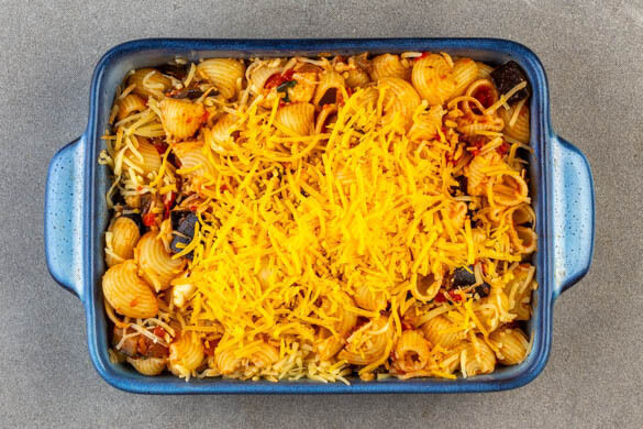 Den Backofen auf 200°C (180°C Umluft) vorheizen. Die übrige Pasta in einer großen Auflaufform verteilen, dann mit dem Gouda vermengen. Den Cheddar über die Pasta streuen und ca. 10Min. im Ofen backen, bis der Käse geschmolzen ist. Tipp: Die Auflaufform mit Alufolie abdecken, falls der Käse zu schnell bräunt.