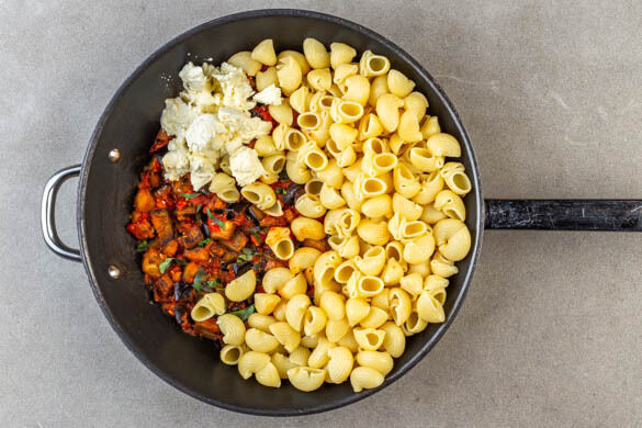 Die Auberginen in einer großen Pfanne mit 1EL Pflanzenöl bei mittlerer Hitze in 10–15Min. goldbraun und knusprig braten, dabei gelegentlich umrühren. 1EL Pflanzenöl, den Knoblauch, die Gewürzmischung, 1TL Salz, 1 Prise Pfeffer, die Tomaten und das Basilikum hinzugeben, ca. 5Min. kochen, dann die Auberginensauce mit der Pasta und dem Mozzarella vermengen.