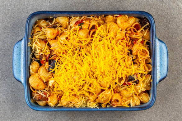 Den Backofen auf 200°C (180°C Umluft) vorheizen. Die übrige Pasta in einer mittelgroßen Auflaufform verteilen, dann mit dem Gouda vermengen. Den Cheddar über die Pasta streuen und ca. 10Min. im Ofen backen, bis der Käse geschmolzen ist. Tipp: Die Auflaufform mit Alufolie abdecken, falls der Käse zu schnell bräunt.
