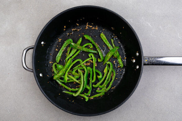 Die Paprika vierteln, entkernen und in dünne Streifen schneiden, dann in einer großen Pfanne mit 1EL Olivenöl, ¼ der Gewürzmischung und 1 Prise Salz bei mittlerer Hitze 2–3Min. anbraten. Tipp: Wer mag, kann auch mehr Gewürzmischung verwenden.