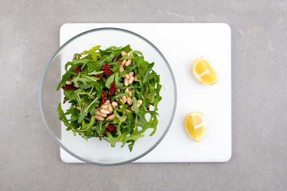 Die Bohnen in einem Sieb mit kaltem Wasser abspülen und abtropfen lassen. Die getrockneten Tomaten grob hacken. Den Rucola mit den Bohnen, den getrockneten Tomaten und dem Dressing vermengen. Die restliche Zitrone in Spalten schneiden.