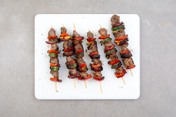 Eine Grillpfanne oder eine große Pfanne bei starker Hitze erwärmen und die Spieße ca. 8Min. rundum anbraten, bis das Fleisch gar und das Gemüse weich ist.