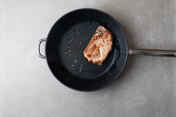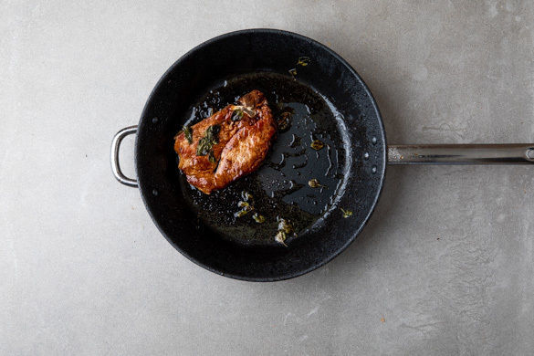 Das Fleisch mit etwas Küchenkrepp trocken tupfen und mit Salz und Pfeffer würzen. In derselben Pfanne mit 1–2EL Olivenöl bei mittlerer Hitze auf jeder Seite 2–3Min. anbraten. Sobald das Fleisch in der Mitte durch ist, das Fleisch samt Bratensaft aus der Pfanne nehmen und beiseitestellen.