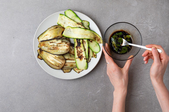 Die Zucchini und die Aubergine längs in 2–3mm dünne Scheiben schneiden. Mit 1/2TL Salz bestreuen und 1–2Min. ziehen lassen, dann die ausgetretene Flüssigkeit mit etwas Küchenkrepp abtupfen.
