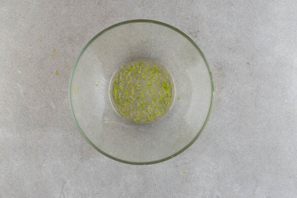 Die Limettenschale fein abreiben, dann die Limette halbieren und auspressen. Die Limettenschale, den Limettensaft, 2EL hellen Essig, 2TL Zucker und ½TL Salz gut verrühren.