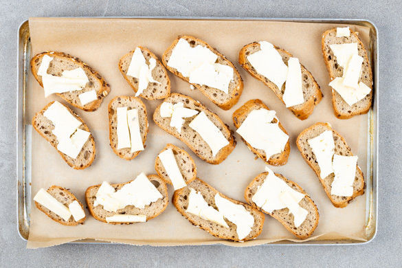 Das Brot in 0,5–1cm dünne Scheiben schneiden. Den Käse in dünne Scheiben schneiden und auf dem Brot verteilen. Die Crostini auf einem zweiten mit Backpapier ausgelegten Backblech 5–7Min. im Ofen backen, bis der Käse geschmolzen ist.