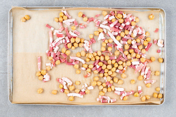 Den restlichen Kichererbsen und den Speck auf einem mit Backpapier ausgelegten Backblech verteilen und 8–10Min. im Ofen rösten, bis der Speck knusprig ist.
