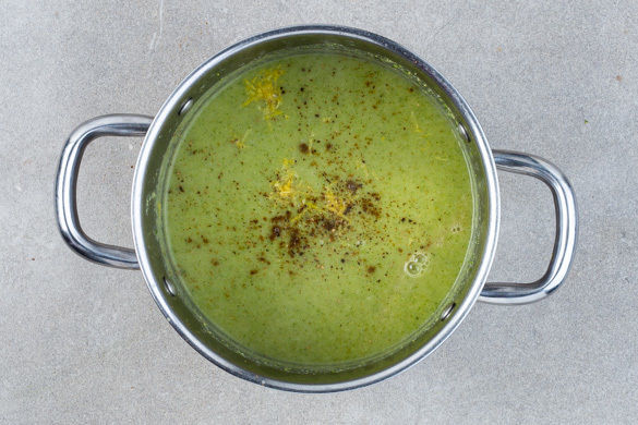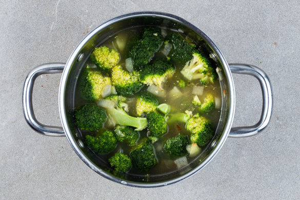 Die Zwiebeln und den Knoblauch in einem mittelgroßen Topf mit 2EL Butter bei mittlerer Hitze ca. 2Min. farblos anschwitzen. 2–3 Prisen Kreuzkümmel unterrühren, dann mit der Kichererbsenflüssigkeit und 700ml Wasser ablöschen. Den Brokkoli, die 1/2 der Kichererbsen und das Brühgewürz unterrühren und die Suppe abgedeckt ca. 10Min. köcheln lassen.