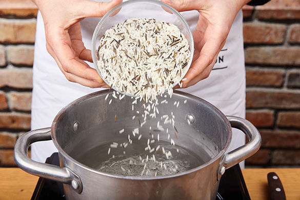 Inzwischen den Reis in dem kochendem Wasser ca. 10-12Min. gar kochen. Schließlich in einem Küchensieb abgießen und ausdampfen lassen. Zurück im Topf warmhalten. Wer den Wildreis weniger knackig will, einfach etwas länger bis zum gewünschten Biss köcheln lassen.