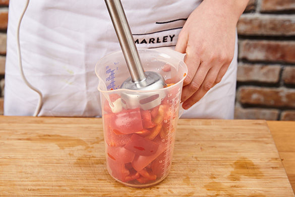 Die Tomaten vierteln, den Strunk entfernen. Die Paprika vierteln, das Kerngehäuse entfernen und nochmals halbieren. Den Knoblauch schälen. Alles zusammen mit einem Stabmixer fein pürieren.